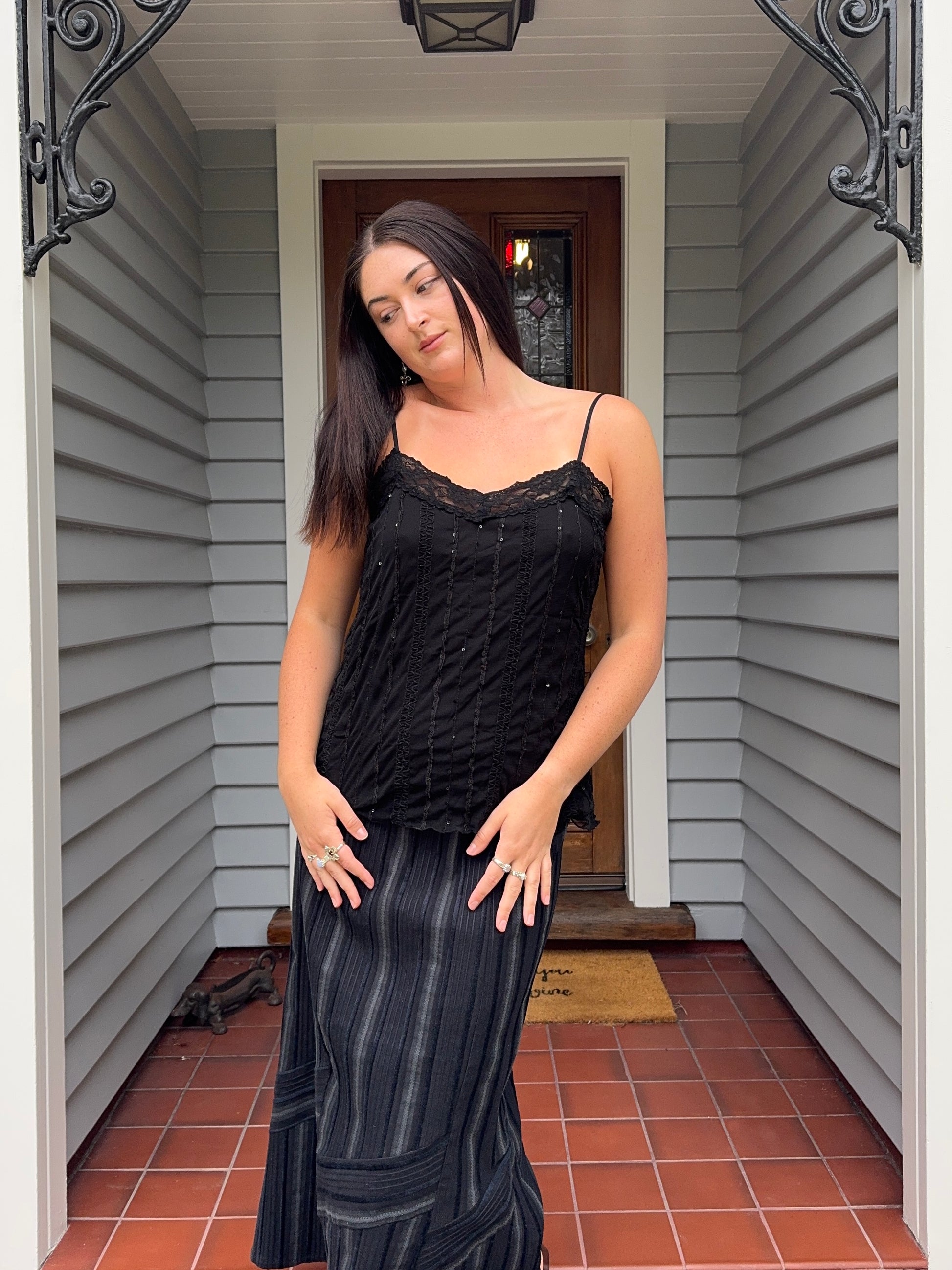 A chic black cami adorned with delicate beading, designed to flatter size M. Perfect for layering under jackets or wearing solo for a sleek, evening-ready look.