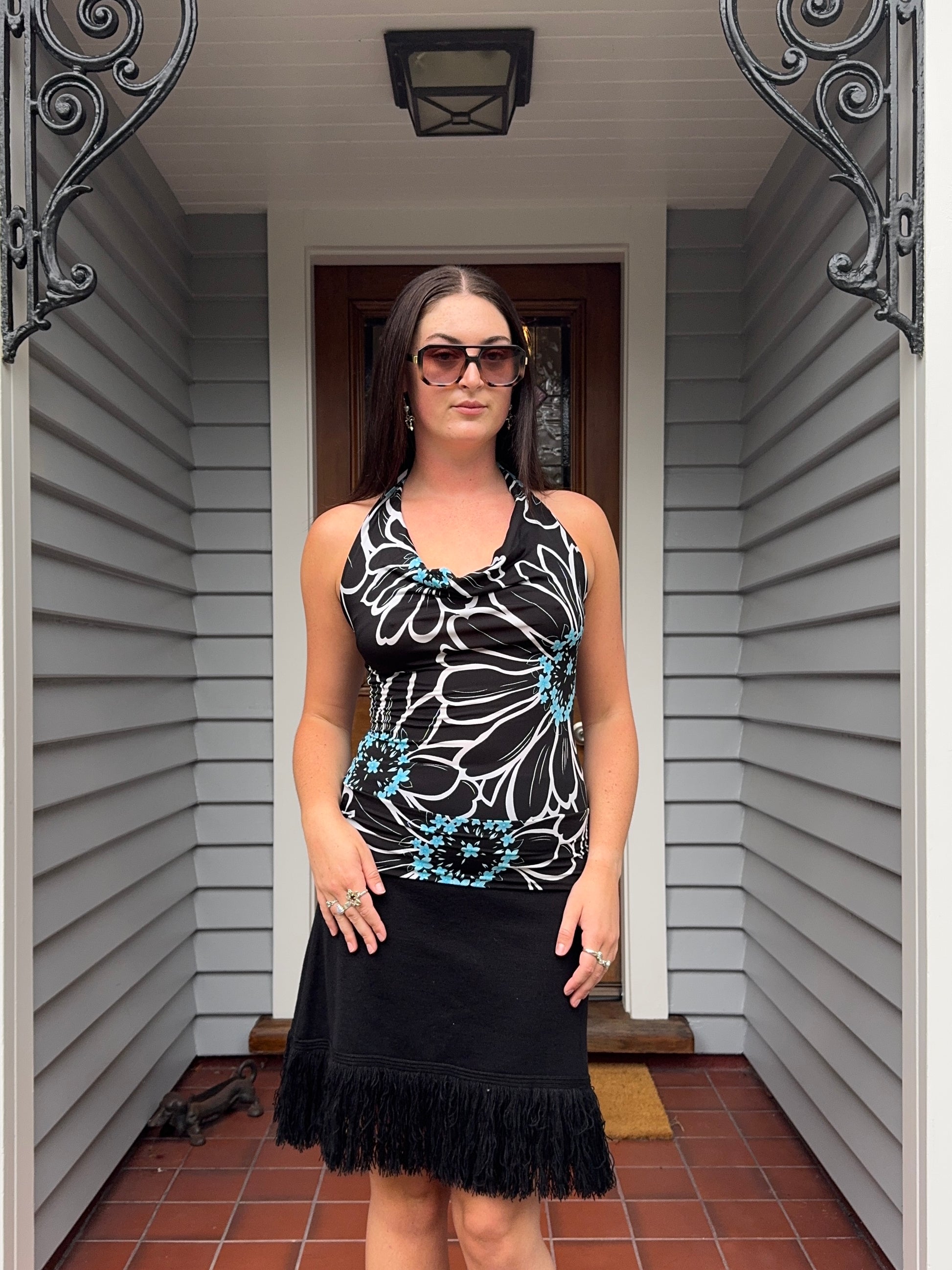 A stylish halter top in black and blue with a flattering fit for size medium. Featuring an open back for a chic, playful touch, it’s perfect for nights out, parties, or dressing up casual outfits.