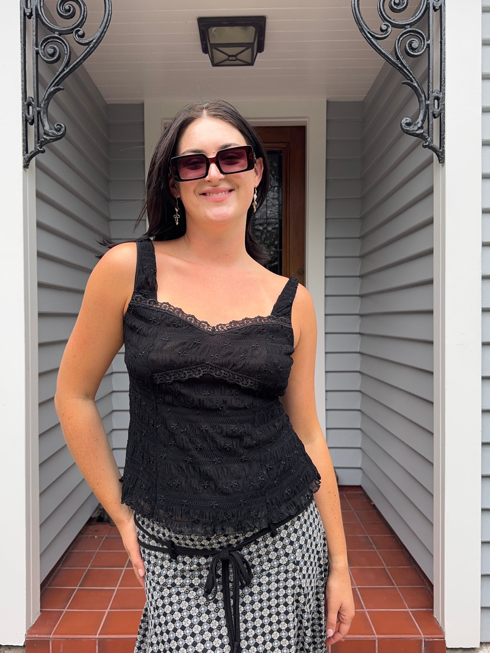 A timeless black lace cami with a flattering fit for size 12. Perfect for layering or wearing on its own, this piece adds a soft, feminine touch to both casual and dressy outfits.