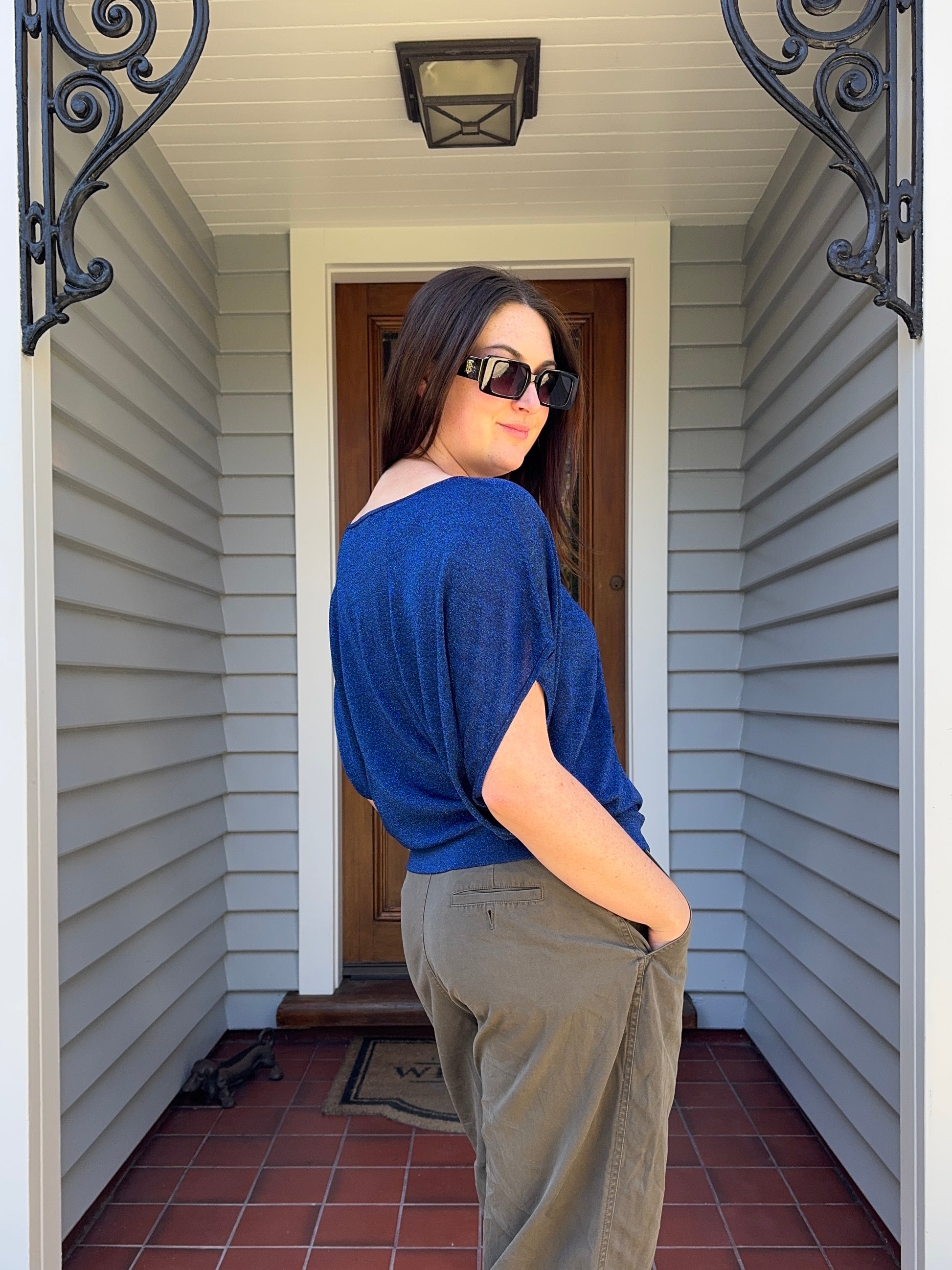 Shine effortlessly in this blue sparkly bat-wing top. With its relaxed drape and shimmering finish, it’s the perfect mix of glam and comfort—ideal for nights out or adding sparkle to your everyday look.