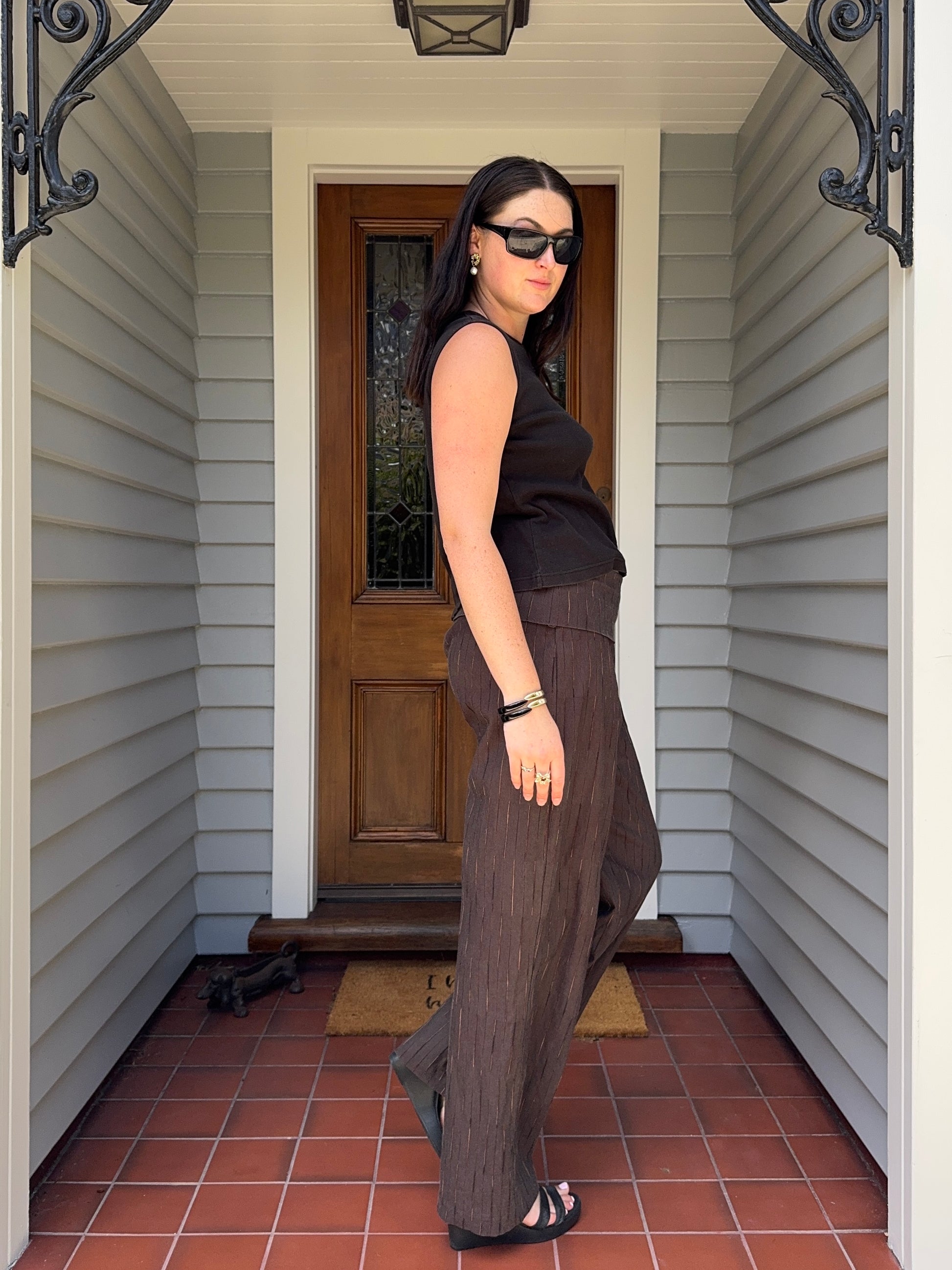 Stylish brown pants featuring subtle stripes and a fold-over waistband for a relaxed, comfortable fit. Perfect for pairing with a tucked-in blouse or fitted top, these pants offer a chic, effortless look for both casual and dressy occasions.