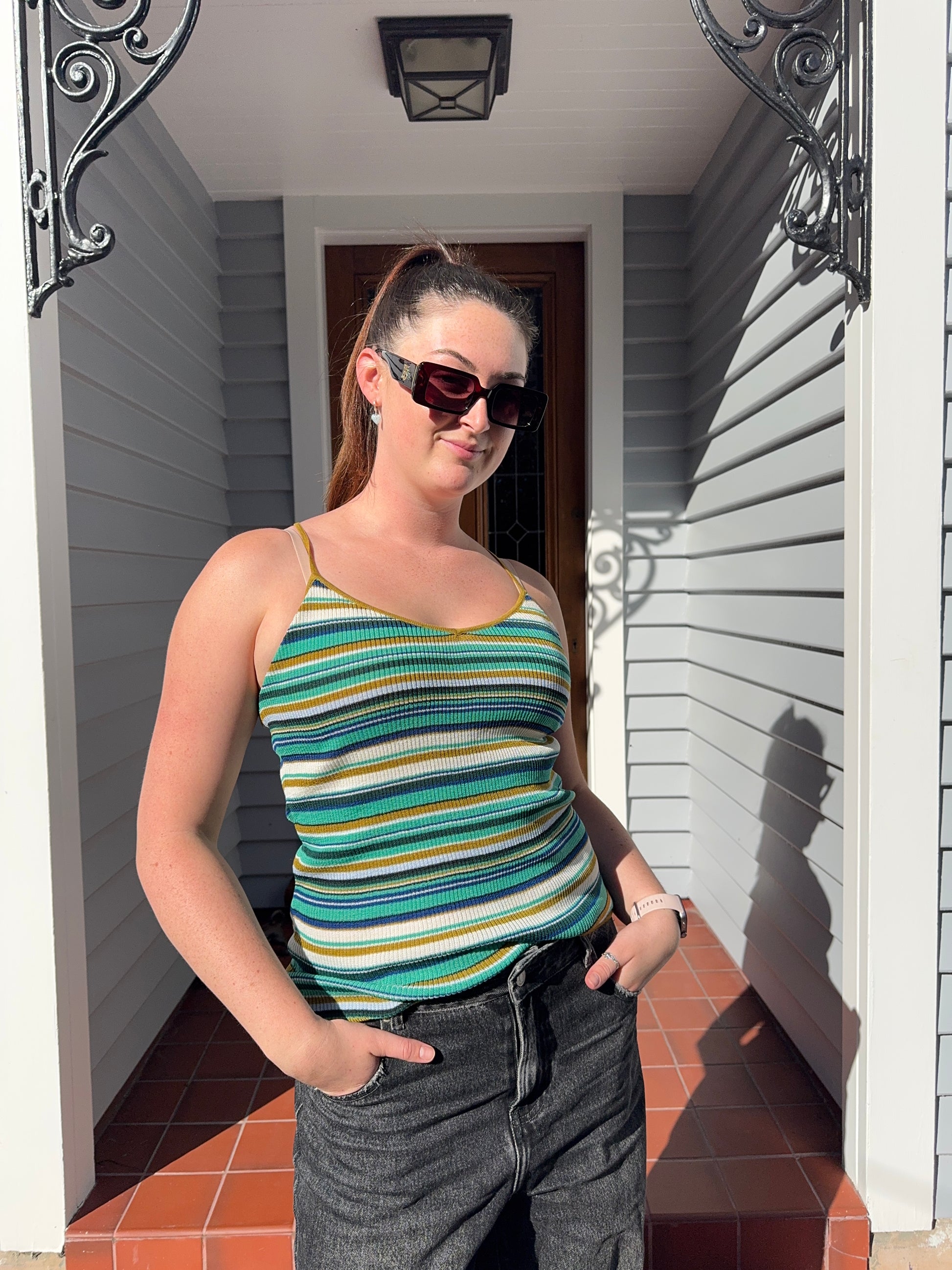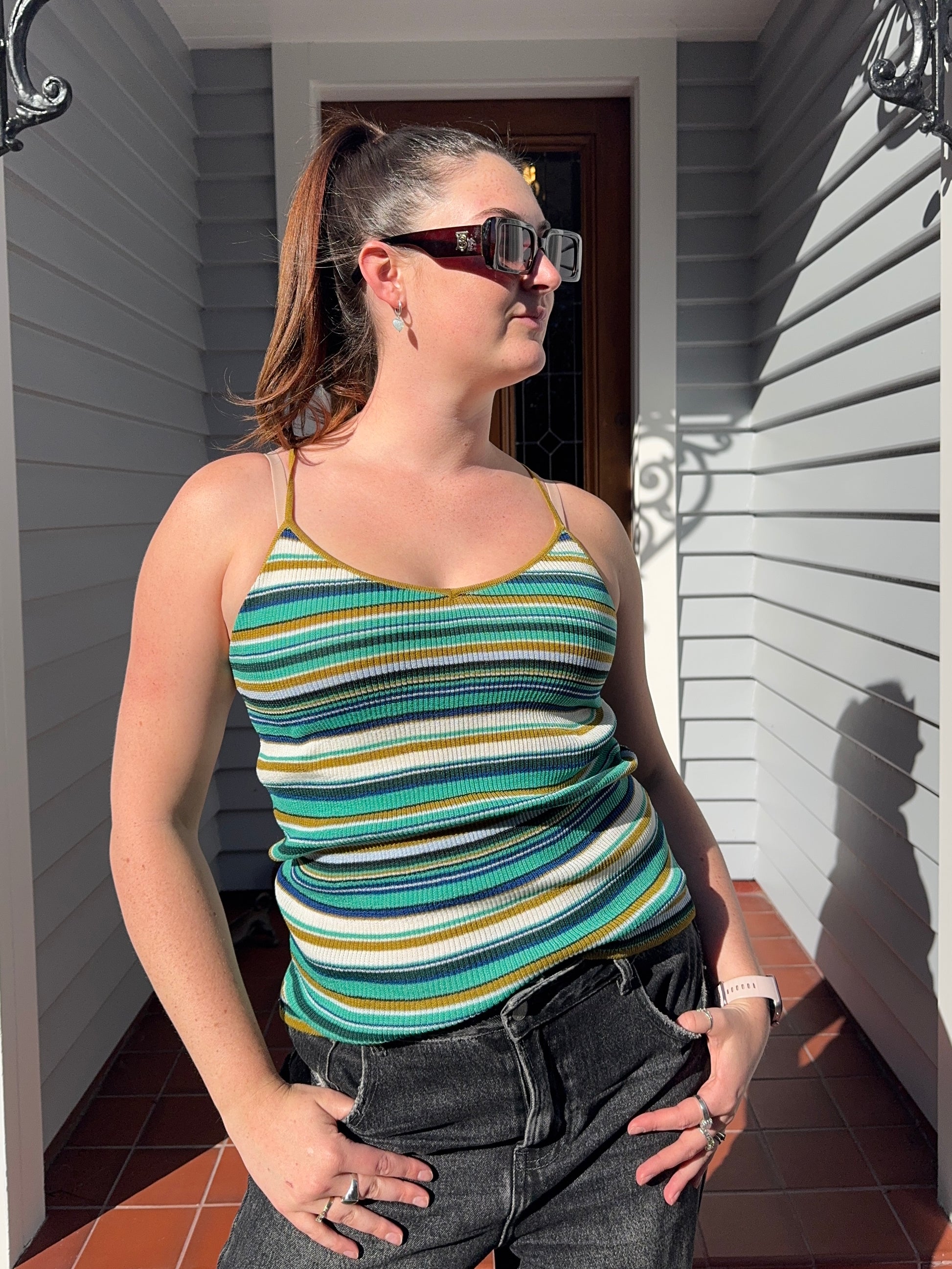 Bright and fun striped singlet, perfect for layering or wearing on its own. Fits size S.
