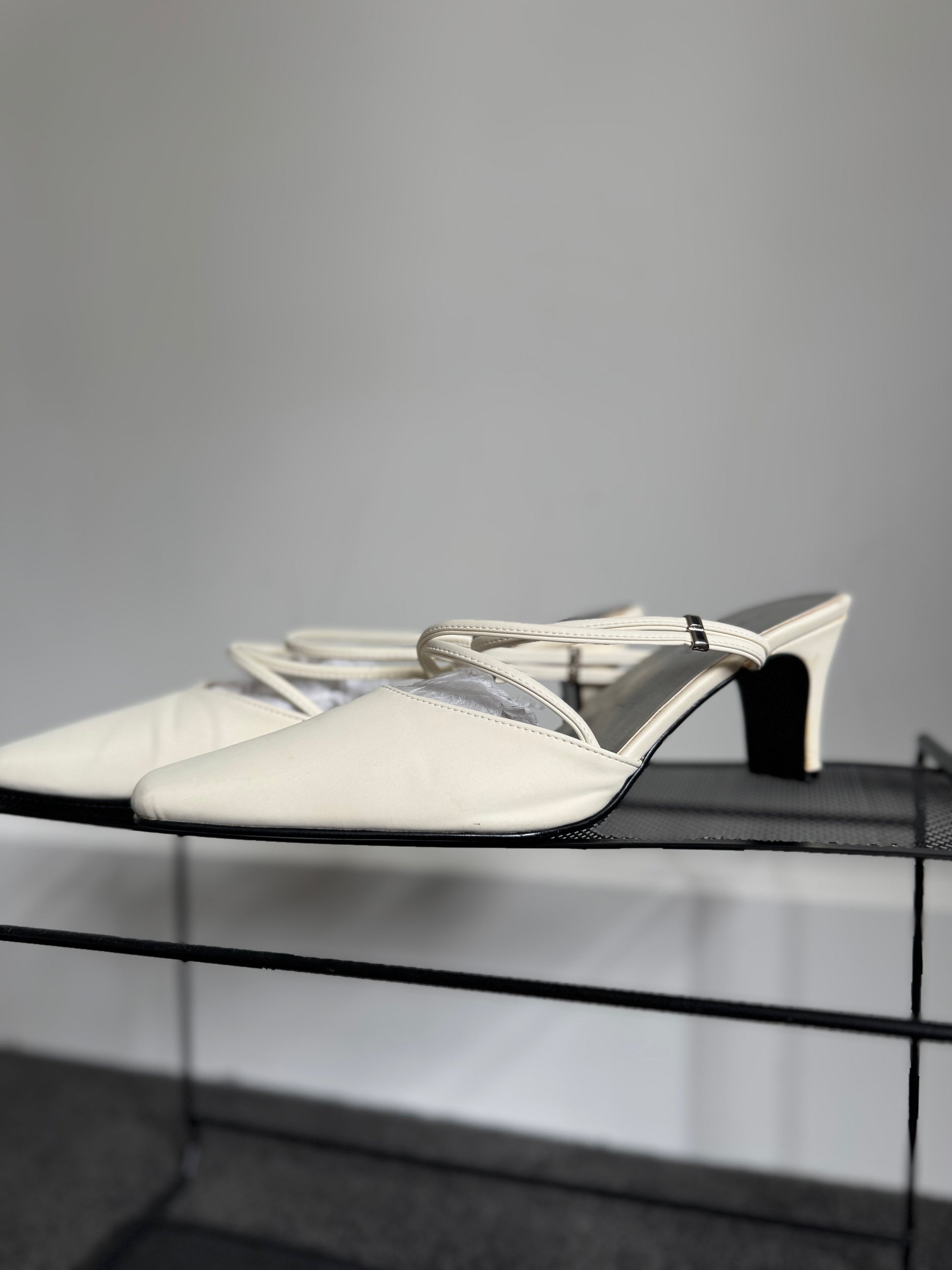 Elegant cream-colored kitten heels featuring delicate straps for a chic and feminine look. Perfect for dressing up skirts, dresses, or tailored pants while keeping comfort and style effortlessly balanced.