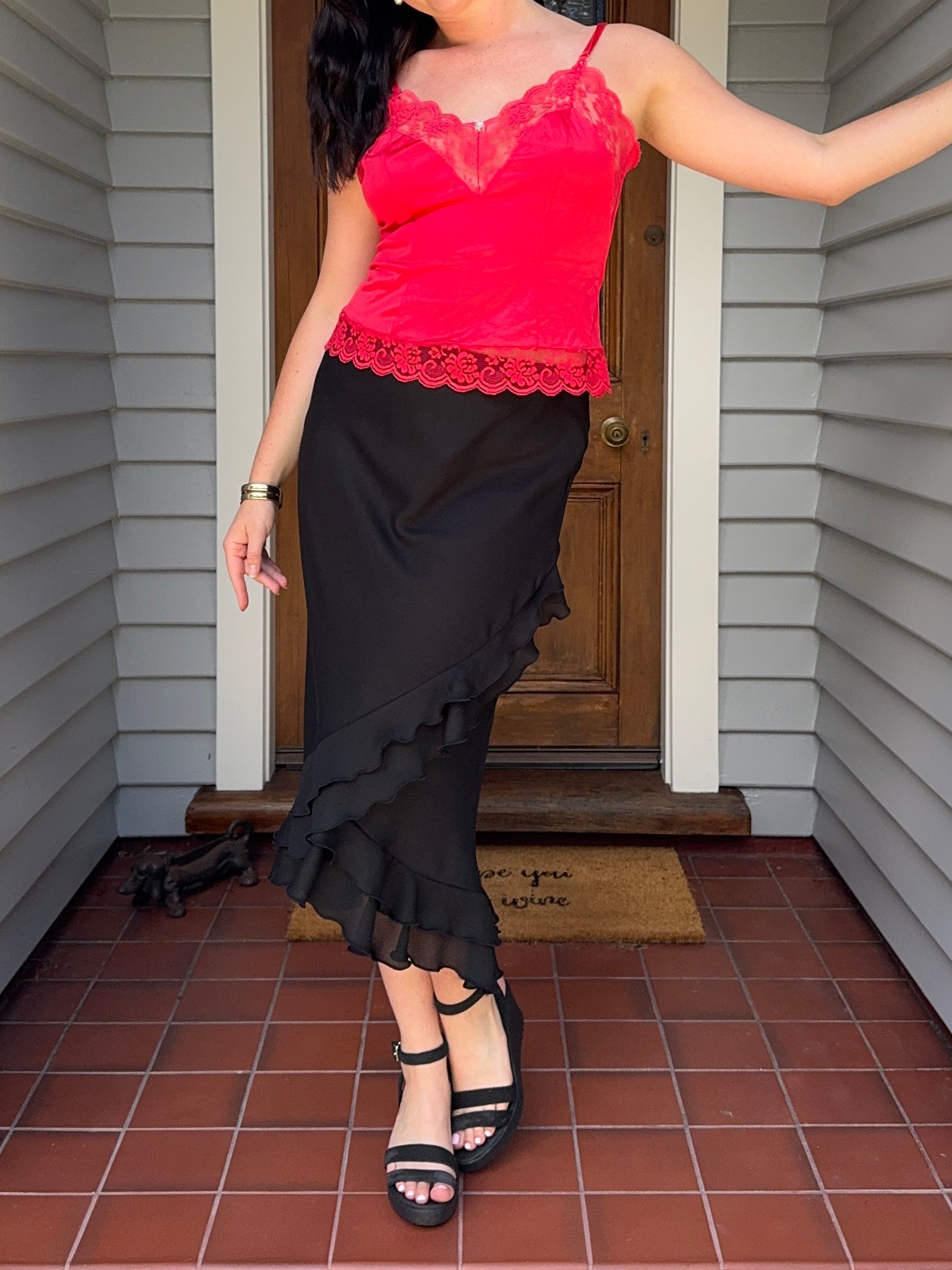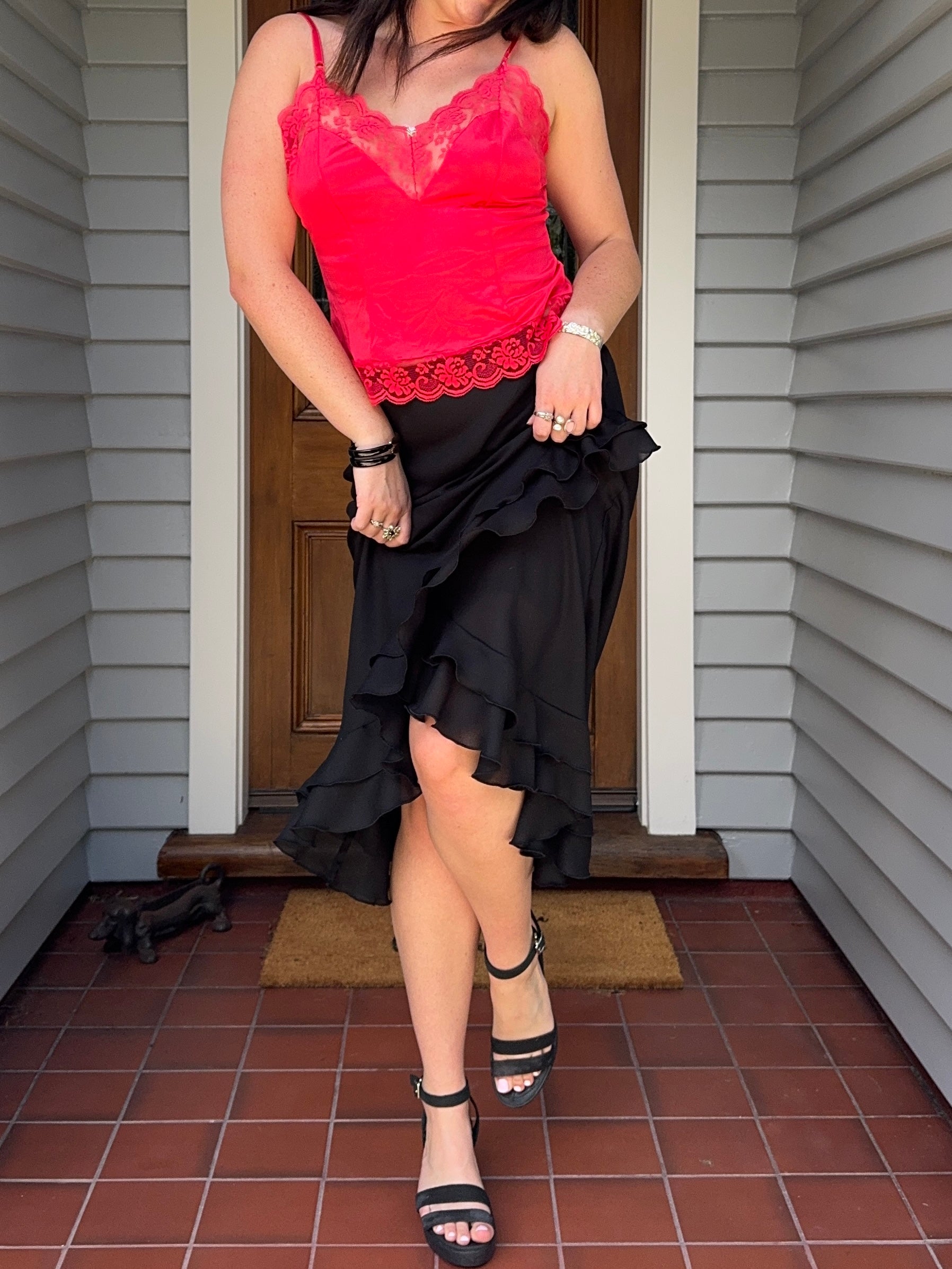 A playful and flirty midi skirt featuring layered frills that move beautifully with every step. Perfect for dancing the night away or making a statement at events, it pairs effortlessly with a fitted top or blouse for a bold, stylish look.