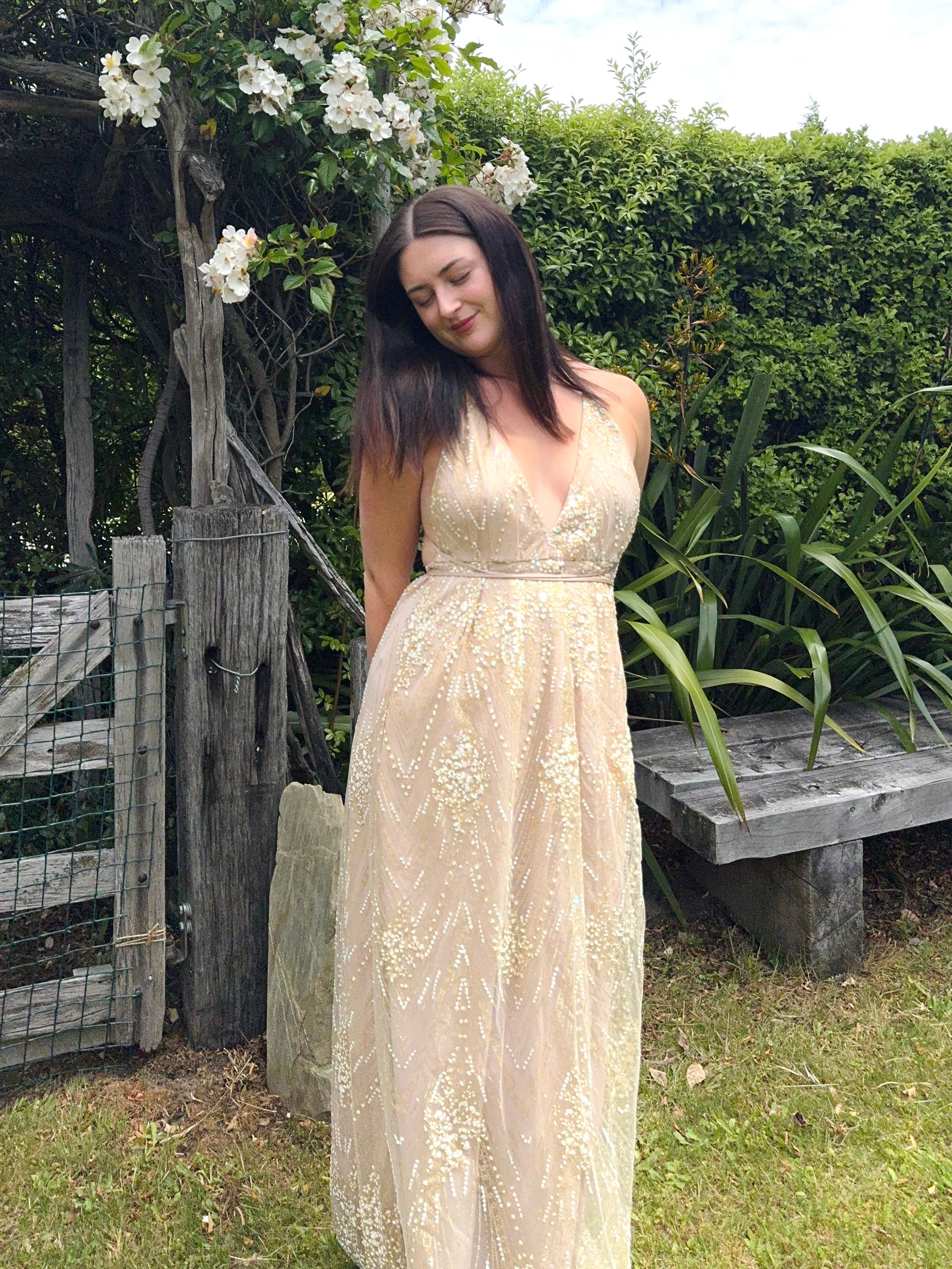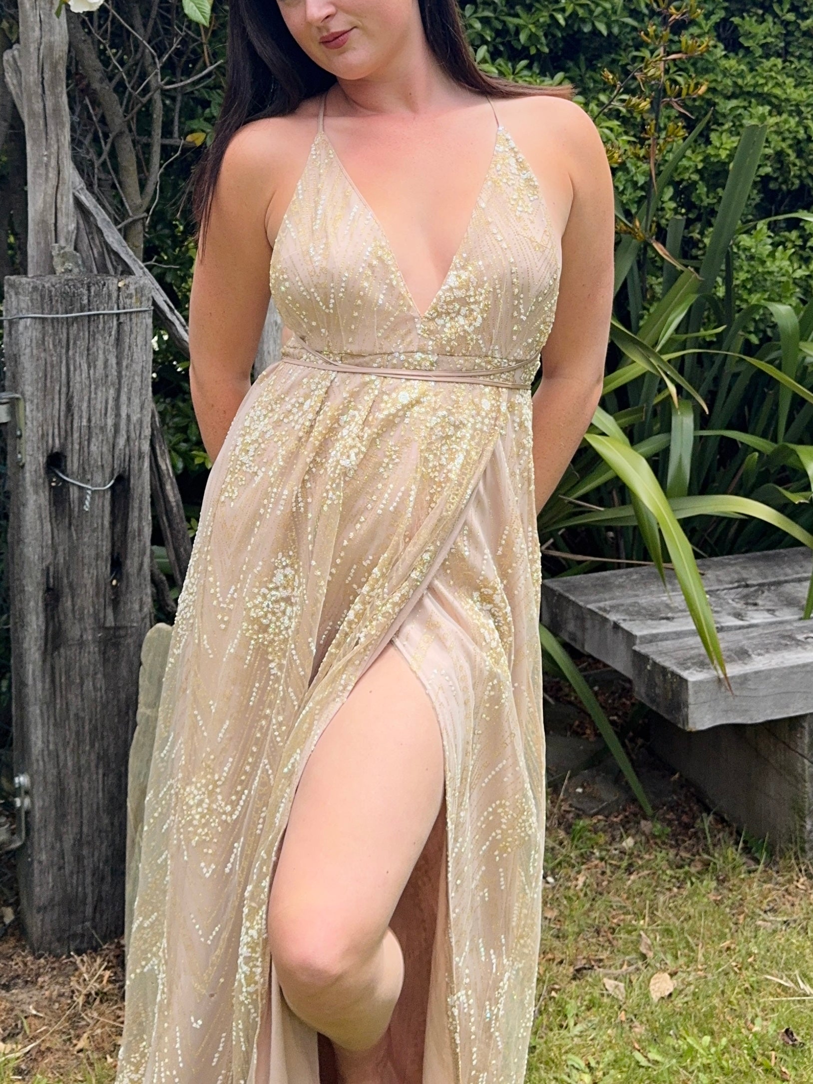 A stunning gold gown designed to flatter a range of shapes. Featuring a soft drape and subtle shine, this piece is perfect for formal events, weddings, or a special night out.