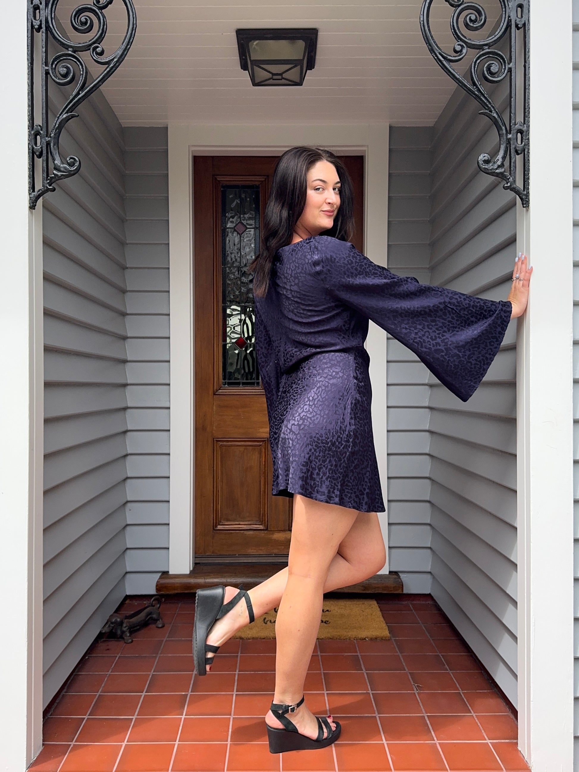 A statement silky mini dress in a navy cheetah print with a flattering fit for size 14. Sleek and eye-catching, this piece is perfect for nights out, parties, or dressed up with heels for a bold look.