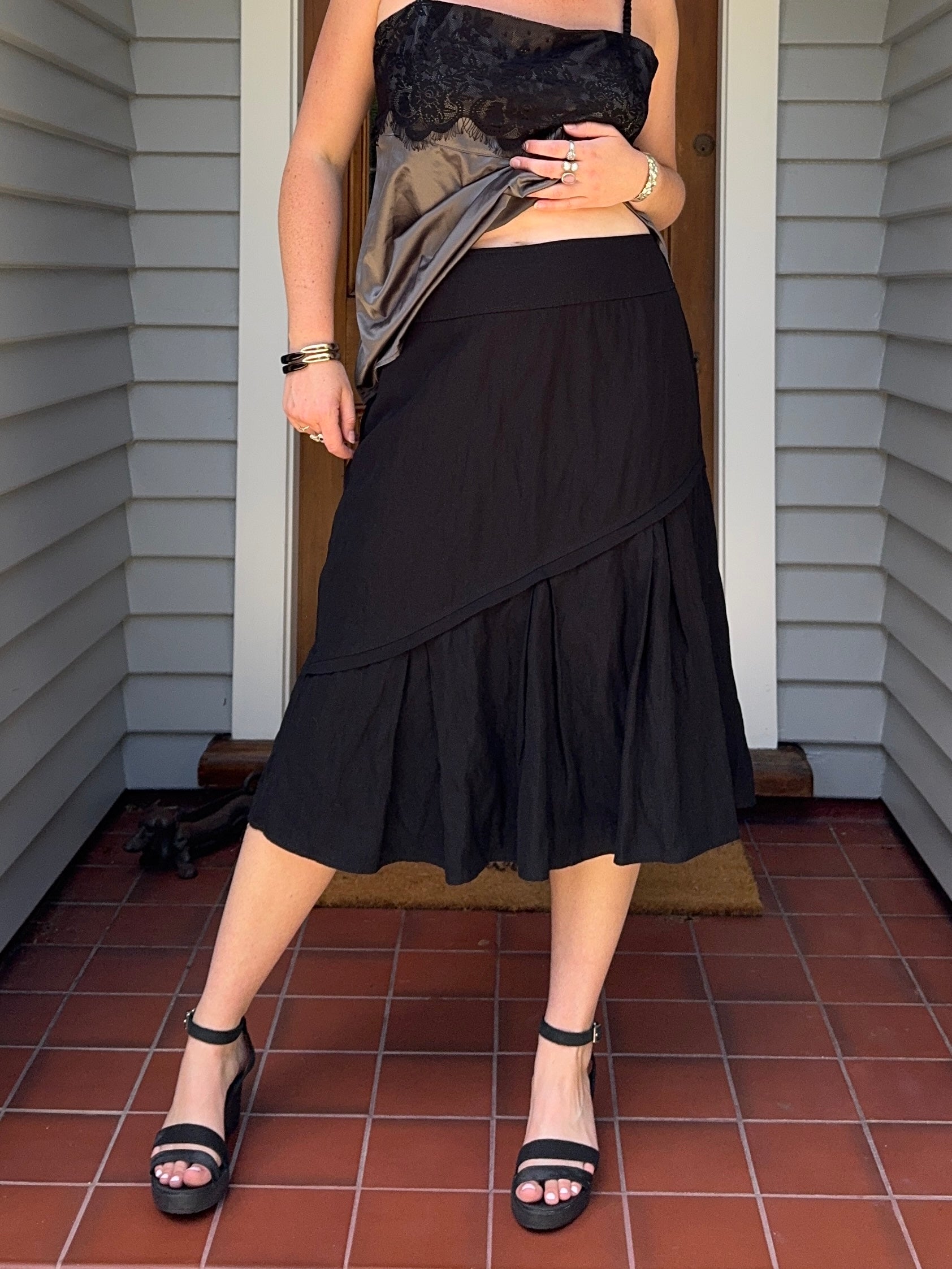A classic black midi skirt from STAXS with a flattering, flowy silhouette. Versatile and timeless, it’s perfect for pairing with tops, blouses, or cropped jackets for both casual and dressy occasions.