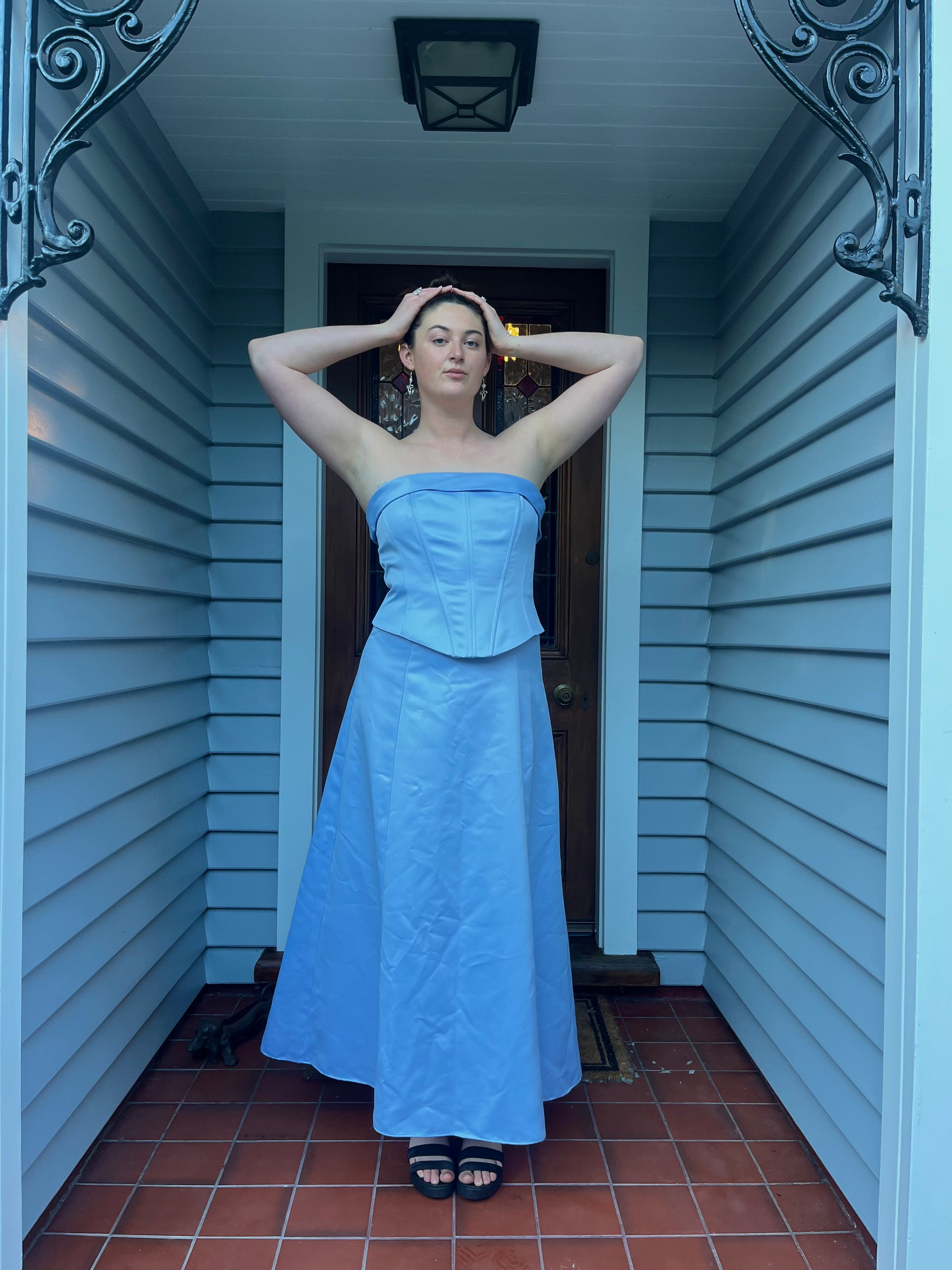 A true statement piece. This strapless blue gown features a flattering silhouette with a structured corset bodice and a soft, flowing skirt. Ideal for formal events, balls, or evening occasions. Elegant, timeless, and designed to make you feel amazing.